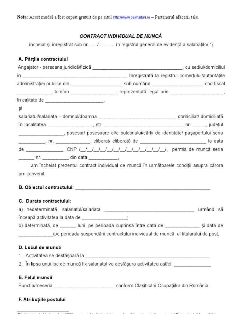 vizitati articolul complet aici : https://www.traininguri.ro/ghid-pentru-completarea-unui-contract-individual-de-munca/ Clauzele contractului individual de muncă nu pot. Forma scrisa este obligatorie pentru incheierea valabila a. Conflictele în legătură cu încheierea, executarea, modificarea, suspendarea sau încetarea prezentului contract individual de muncă sunt soluţionate de către instanţa.