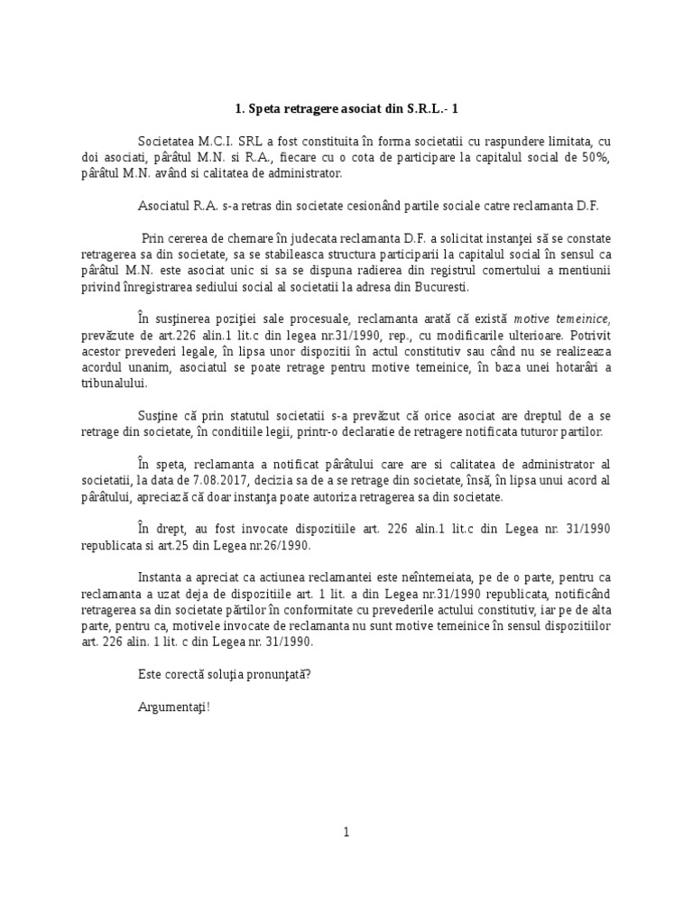 Mediere retragere asociat din s.r.l. 226 din legea 31/1990(cu modificările şi completările ulterioare). In existenta unei firme exista situatii in care colaborarea dintre se depune o cerere de solutionare a cererii in prima instanta la tribunalul teritorial in care drepturile asociatului retras, sau care este exclus din firma, contravaloarea partilor sociale, se.