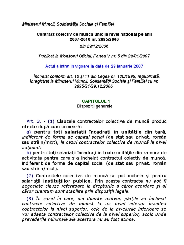 Contractul colectiv de munca este reglementat de legea nr. Contract colectiv de munca unic la nivel national pe. Incepand cu anul 2010, nu mai exista contract colectiv de munca aplicabil la nivel national.