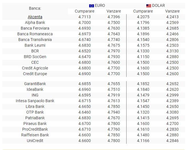 Cursul valutar de joi cotează moneda euro la 4.8167 lei, dolarul american la 4.2539 și francul elvețian la 4.5447 lei. Curs de schimb valutar la ghiseul bancilor comerciale din romania. Acesta se stabilește pe baza cursului valutar mediu la care se adaugă, de obicei, o marjă.
